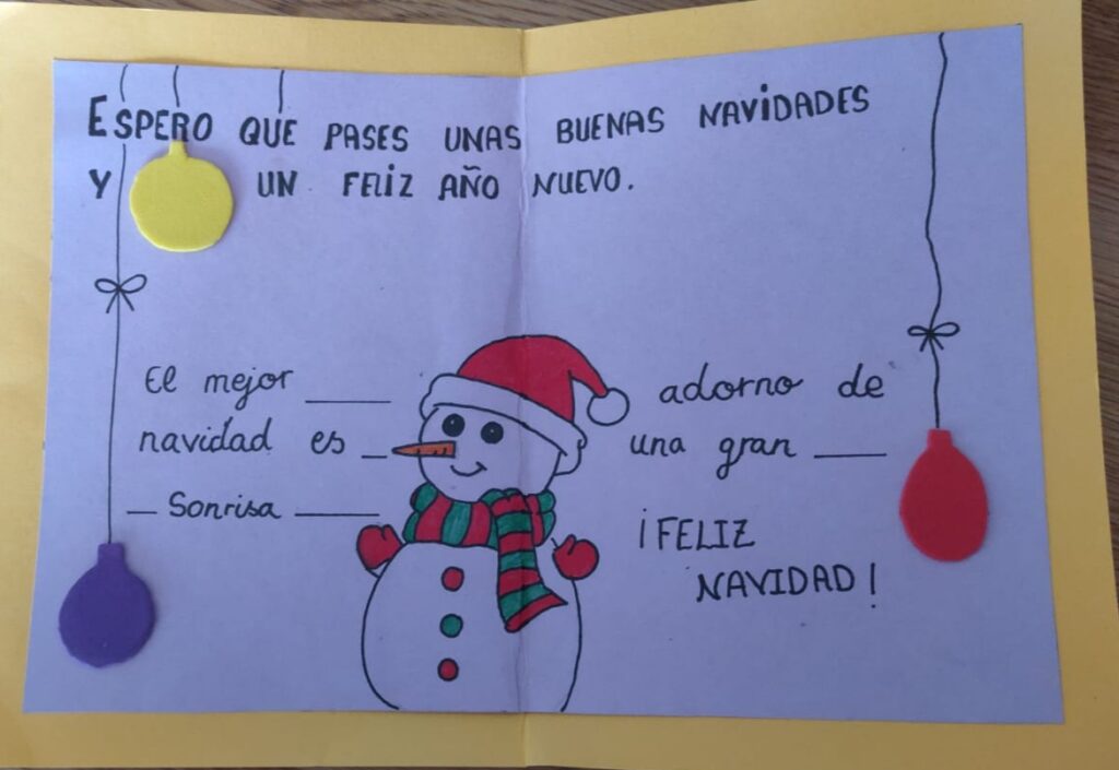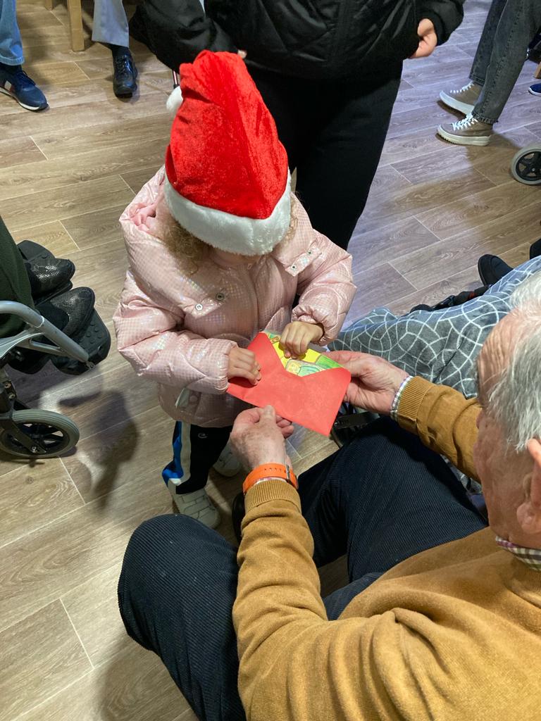 Gracias a la iniciativa del departamento de Pastoral del colegio, y de la mano de su coordinador, Francisco Jimeno, los alumnos de infantil, primaria y secundaria crean, por tercer año consecutivo, lazos con los mayores del pueblo en forma de postal navideña que ellos mismos les entregan.
